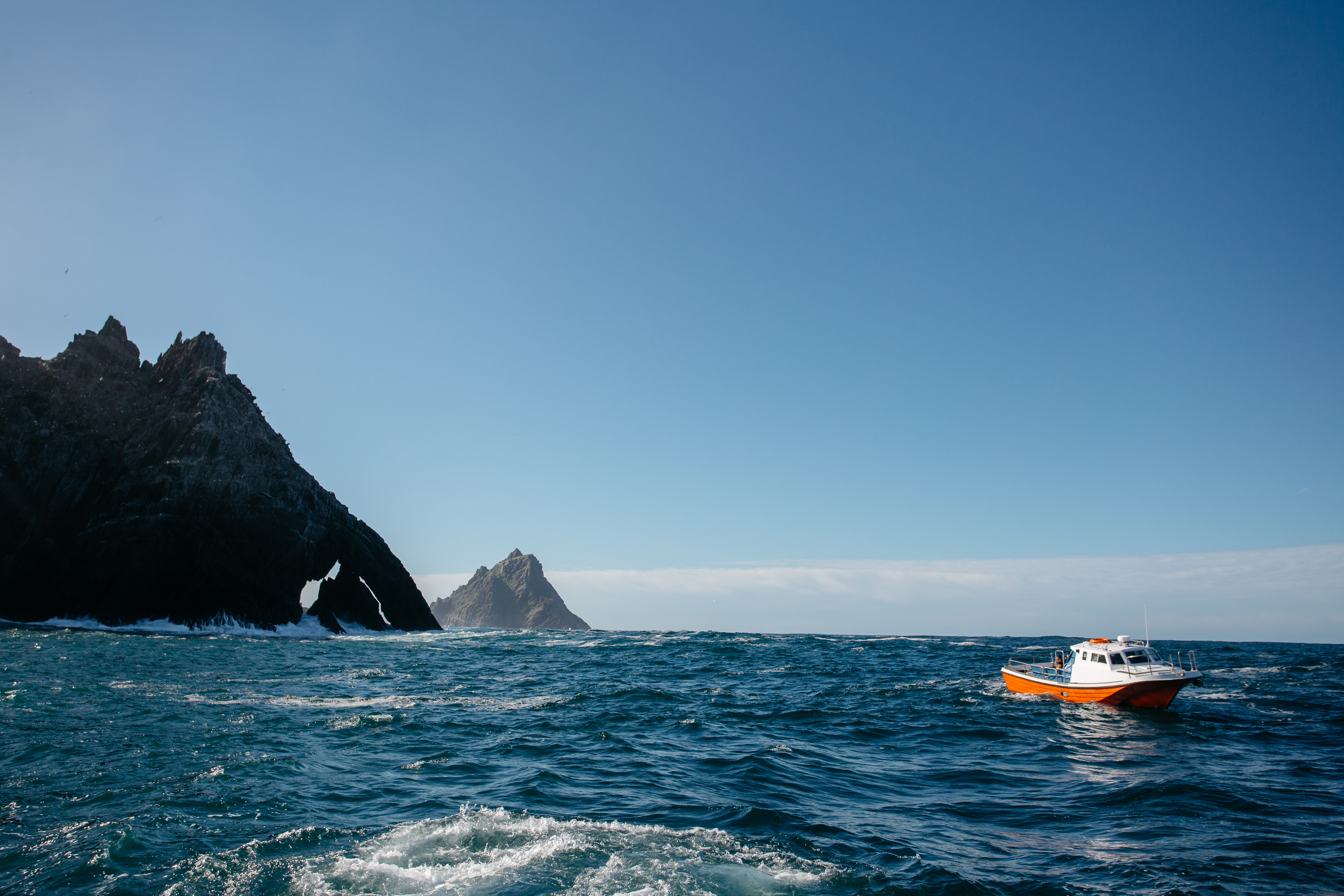 From the mainland at Portmagee, boats set out to the Skellig Islands, which rise sharply from the Atlantic. Settled by monks well over a millennium ago, Skellig Michael preserves the remains of a 6th-century monastery. Small stone beehive huts, or clocháns, mark where the monks lived and worked. By late October, boats no longer dock, so I could only view the island from the water, impressed by the steep slopes and stone structures that did little to deter the monks from the solitude they sought.